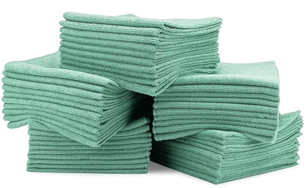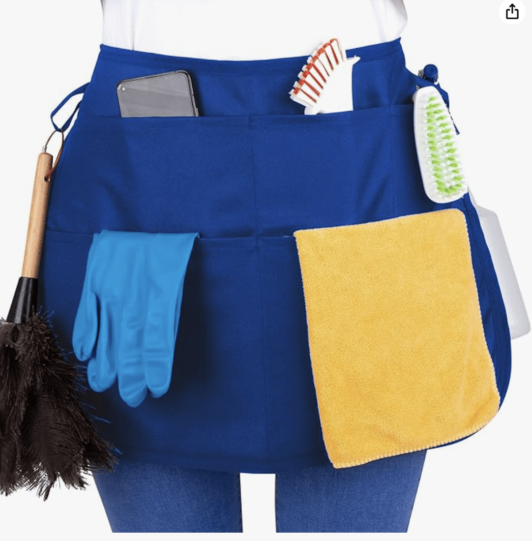 The cleaning apron saves more time than all other products combined. It carries all the supplies and tools you need to walk around the room once, then you’re done. Wear it when cleaning from start to finish. Always put the sprayers back in the same loops, and the tools in the same pockets after each use. You should know where everything is without looking. Practice until its automatic!